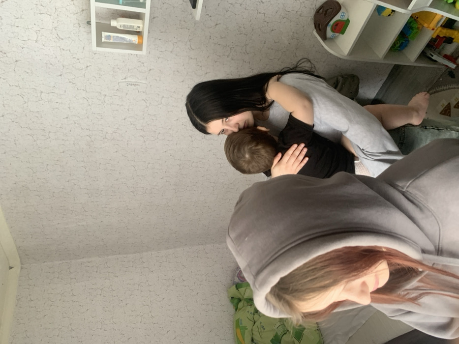 This image depicts an indoor residential scene located in the city of Фоки, Russia. Three individuals are present. In the foreground on the left, a person with reddish-brown hair wears a grey hooded sweatshirt with the hood up, obscuring their face from the frontal view as they look downwards and to the left. In the midground, towards the right, a young female with long, dark hair, wearing a light grey long-sleeved top and light blue jeans, holds a small child. The child, viewed from behind, has light brown hair and wears a black t-shirt, appearing to lean into the female's embrace; their bare feet are visible. The female's expression is neutral as she looks towards the left. The room features light-colored walls covered with textured wallpaper. A bed with a green and white patterned duvet is partially visible on the left. On the right wall, a white cubby shelf contains various items including bottles and tubes. Below it, a multi-tiered white shelving unit displays children's toys, including a brown mushroom-shaped decorative item on the top shelf. The floor is light-colored, possibly wood or laminate, with a circular rug featuring a pizza slice design.