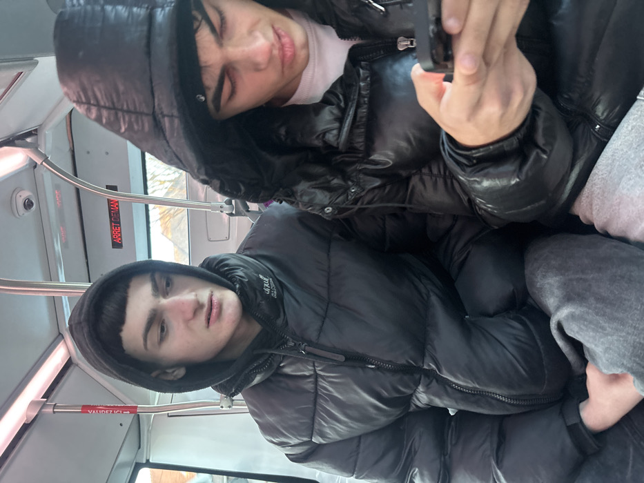The image captures two young males seated inside a public transport vehicle, likely a bus or tram, in Ostwald, France