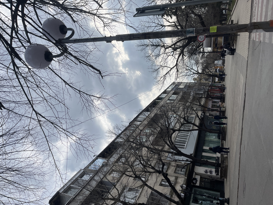 The image depicts an urban street scene in Ruse, Bulgaria, on an overcast day. The view looks down a wide pedestrian street flanked by buildings and trees. In the upper right foreground, a grey metal lamppost with two spherical white luminaires extends upwards, partially silhouetted by numerous bare, dark tree branches that dominate the upper third of the frame against a cloudy sky. On the left side, a multi-story residential or commercial building with a light-colored facade features multiple windows and balconies. Its ground level houses several retail storefronts, including one clearly identifiable as an "Adidas" store. A wide, patterned paved pedestrian walkway occupies the midground, separated from a narrow asphalt road visible on the far left. Several leafless trees with dark trunks are planted along the pedestrian path, extending into the mid-distance. Multiple individuals are present on the walkway: one person in a dark coat walks away from the camera in the left midground, two others stand near a shop entrance further down the street, and additional indistinct figures are visible in the distant background, some appearing to be seated on benches. On the far right midground, a second utility pole with various signs affixed stands partially obscured by branches. The environment is typical of a bustling city center or commercial district.