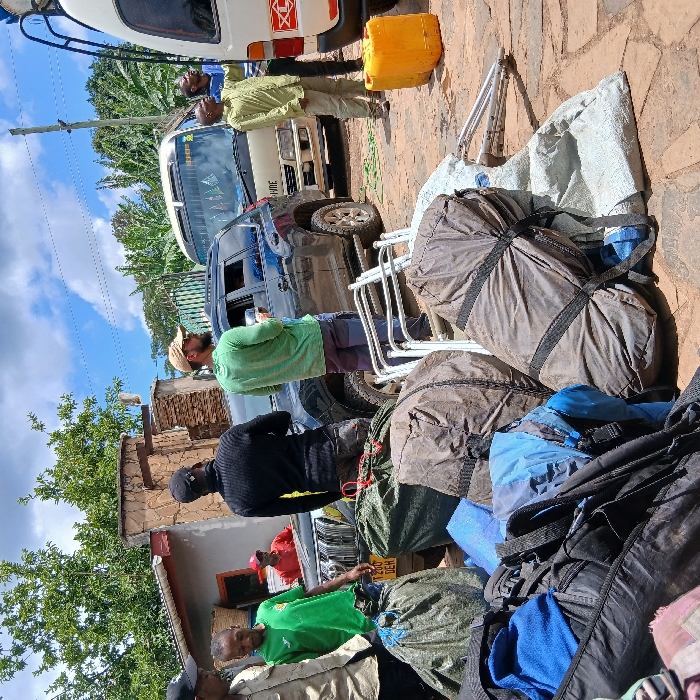 The image depicts an outdoor staging area in Mweka, Tanzania, under a partially cloudy sky. Six adult males are present, along with three vehicles and numerous pieces of luggage and equipment. In the foreground, a cluster of large, soft bags or duffels in various colors (olive green, dark brown, black, blue, and light grey) are piled on a reddish-brown paver and dirt surface. Several disassembled or folded metal-framed chairs are also visible on the ground. To the immediate right, a yellow plastic jerrycan rests on the ground next to a white van. From left to right, the individuals and vehicles are arranged as follows: * A man in a light-colored shirt and black cap stands on the far left, partially obscured. * Next to him, a man in a green t-shirt stands. * Behind them and to the left, a portion of a simple building with a corrugated iron roof and stone-clad facade is visible. A man in a red shirt is partially visible inside a dark grey SUV, which is parked facing the foreground. This SUV, likely a Toyota Land Cruiser Prado, is dark grey. * A man in a black long-sleeved shirt and black cap stands with his back to the camera, facing the dark grey SUV. * To his right, a man in a green t-shirt, beige wide-brimmed hat, and sunglasses stands near the open passenger door of the dark grey SUV, looking towards its interior or side. * Behind the dark grey SUV, a beige van or minibus, resembling a Toyota Hiace, is parked. * To the right of the beige van, a man in a light green shirt and light-colored pants stands, looking towards a white van or minibus, also resembling a Toyota Hiace, which is partially visible on the far right. * A seventh man in a blue shirt is visible further back, near the white van. Lush green trees and vegetation are present in the background, particularly on the right side. The scene suggests preparations for travel or an expedition, with equipment being handled or organized.