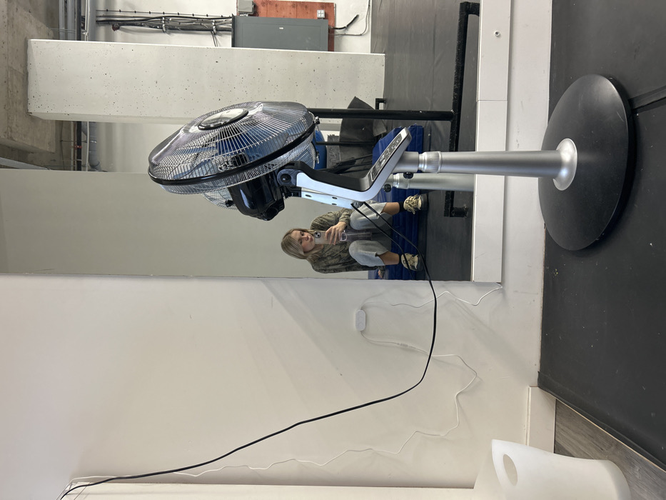A mirror reflects a space, showcasing a woman crouching with a phone in hand, presumably taking a photo. Reflected nearby is a standing fan. The physical setting features a white wall, a black power cord snaking across it, and the edge of a white trash can. The room appears to be an industrial-style space with concrete beams and exposed conduit in the background.