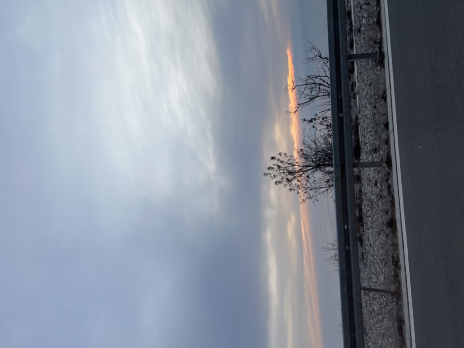 The image presents an outdoor scene at either sunrise or sunset, observed from a roadside perspective in Brajici, Montenegro. The sky dominates the upper two-thirds of the frame, characterized by layered, overcast clouds. The upper portion displays dark grey and bluish-purple cloud masses, transitioning to lighter grey and white streaky clouds mid-frame. A prominent horizontal band of orange and pink light extends across the horizon, indicating the sun's position below the visible line. In the foreground, the bottom portion of a dark grey asphalt road is visible. Above the road, a silver-colored metal guardrail, composed of horizontal beams supported by vertical posts, runs parallel to the viewer. Behind the guardrail, a light grey, rocky, and gravel-covered embankment is present, showing minimal sparse vegetation. Several deciduous trees with dark, bare branches are silhouetted against the colorful horizon, with one tree on the left exhibiting some remaining leaves. The distant background appears hazy, consistent with a landscape viewed under atmospheric conditions near the horizon. No individuals, animals, or active subjects are visible in the scene.