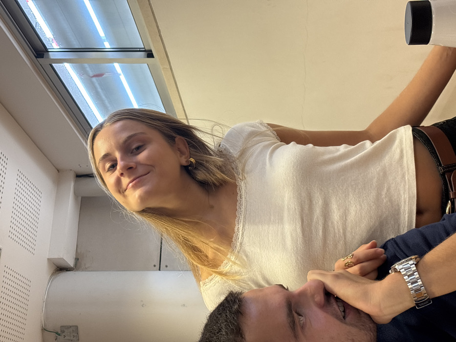An indoor scene in Oeiras, Portugal, depicts two young adults. A female subject is positioned in the midground, with her head tilted to the left, looking directly at the camera with a slight smile. She has fair skin and long blonde hair, wears gold hoop earrings, a thin gold chain necklace, and a gold-colored ring on her left hand. Her attire consists of a white, short-sleeved top with lace trim at the neckline, which exposes a portion of her abdomen, dark trousers, and a dark belt with a brown strap and metal buckle. Her left arm is visible, resting on a light-colored surface. In the bottom left foreground, the partial profile of a male subject is visible, looking downwards and to his right, out of frame. He has dark hair, stubble, and his right hand is raised to his mouth. He wears a dark blue long-sleeved shirt and a silver-colored metal link watch on his left wrist. The environment includes light-colored walls in the background and a white ceiling with perforated acoustical panels in the upper left. A large white cylindrical pillar or duct runs vertically in the upper left. A multi-pane window is visible in the upper right, showing reflections and condensation on its surface, with an artificial light source beyond it. A white bottle with a black cap is partially visible on the light-colored surface in the lower right.