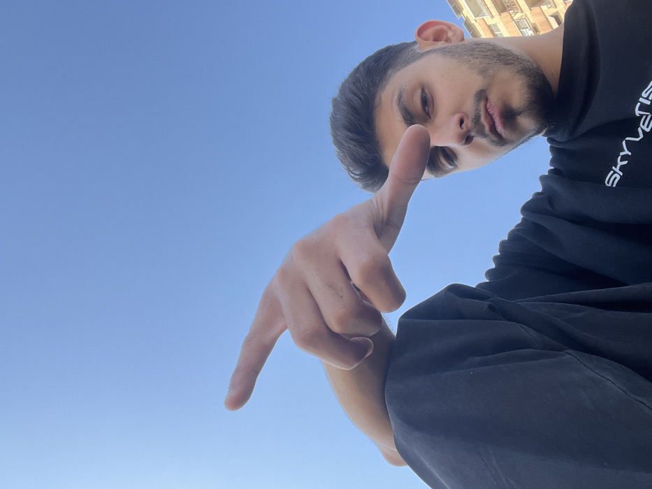 A young adult male is depicted in a low-angle outdoor portrait, facing the camera directly with a neutral expression. He possesses dark hair and a short beard. He wears a black long-sleeved shirt with the white text "SKYVETIS" visible across the lower chest area, and dark-colored pants. His left arm is raised and positioned in the foreground, with the hand forming a gesture where the index finger is extended forward and the thumb is raised, creating a loose 'L' shape. The background features a clear, bright blue sky. On the far right side of the frame, a segment of a multi-story, light-colored urban building with visible windows and balconies is present, indicating an outdoor setting within As-Salihiya Municipality, Syria.