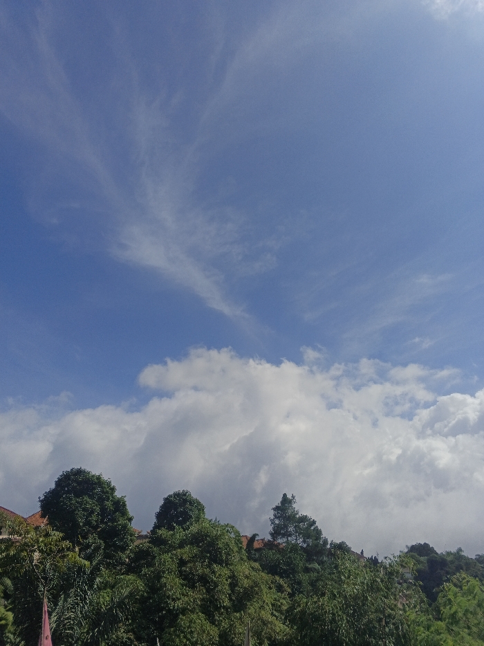 A vibrant blue sky is partially filled with wispy cirrus clouds and dense cumulus formations. Lush green trees cover a hillside in the foreground, with glimpses of red-tiled roofs suggesting buildings among the vegetation. A red and white flag or banner is also visible among the trees, adding a splash of color. The light seems to be bright and sunny.
