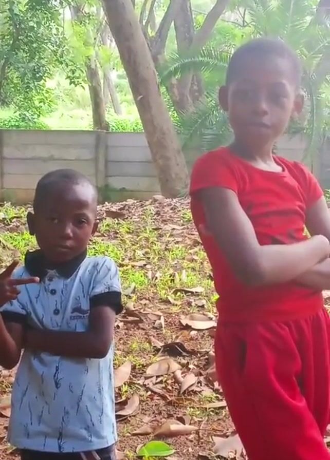 Two young boys are standing outdoors on a ground covered with fallen leaves and some small plants