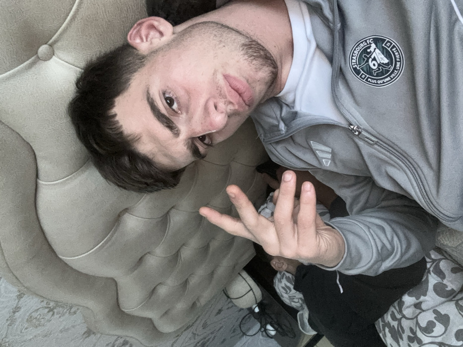 An indoor scene, likely a bedroom, features a male subject capturing a selfie with a second individual present in the background. The precise location within the city of Bulishi, Georgia, is not ascertainable from the provided image. The primary subject is a male with dark hair styled with short, straight bangs, light stubble on his chin, and a clear complexion. He is oriented towards the camera, with his lips slightly pursed. He wears a grey full-zip jacket by Adidas, identifiable by the three stripes on the shoulder and an Adidas logo on the chest. Underneath, a white t-shirt collar is visible. On the left chest of the jacket, a circular patch displays "STRASBOURG FC," the number "67," and the French text "PLUS QU'UNE VILLE, UNE FIERTE" encircling a graphic of a figure. His left hand is raised, forming a gesture with the index and middle fingers extended in a 'V' shape, while the ring and pinky fingers are curled. In the left background, partially obscured, a second individual lies down, appearing to be asleep or resting. This person is covered by patterned bedding and is wearing a dark top, possibly a hoodie. Behind this individual, a light-colored, possibly woven object resembling a hat or basket, and dark cables are visible on a surface. The general background includes a cream-colored, tufted headboard or upholstered backrest and bedding with a grey floral or leaf pattern on a light background.
