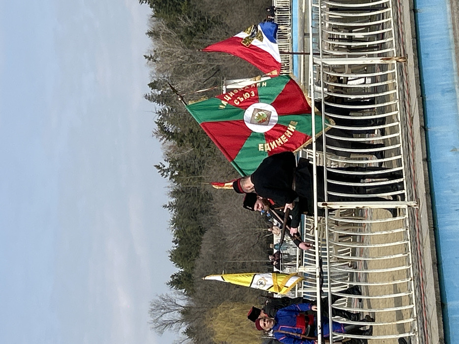 An outdoor scene in Borisova Gradina, Sofia, Bulgaria, displays a gathering centered around individuals in historical attire and commemorative flags. In the foreground, a light blue concrete edge of a water feature is visible, topped by a white metal railing spanning horizontally. Behind the railing, three prominent figures are positioned. A man in the center-left, with a dark beard and wearing a dark, possibly Cossack-style, uniform with a tall dark hat, holds a long dark rifle or musket horizontally. To his right, another man in a similar dark uniform and hat faces towards the first man, his back partially obscured. Further to the left, a man in a vibrant blue tunic with red accents, dark pants, and a red-banded dark hat stands, looking to his right. Additional individuals in similar attire are partially visible to the far left. Three flags are prominently displayed. The largest flag, centrally located, is divided vertically into red and green fields, featuring a central white circular emblem with a green leaf design. Cyrillic text reading "НАЦИОНАЛЕН СЪЮЗ" (National Union) and "ЕДИНЕНИЕ" (Unification/Unity) is visible. To its left, a yellow flag with a white circular emblem is present. To its right, a red, white, and blue flag, possibly incorporating a coat of arms on a white field, is also displayed. The background features a dense collection of evergreen and deciduous trees, with a large, pale-trunked willow tree on the far left. The sky is light blue with scattered clouds. Numerous indistinct figures, presumably spectators, are visible in the mid-ground behind the railing. The setting indicates a daytime public event, likely during late winter or early spring.