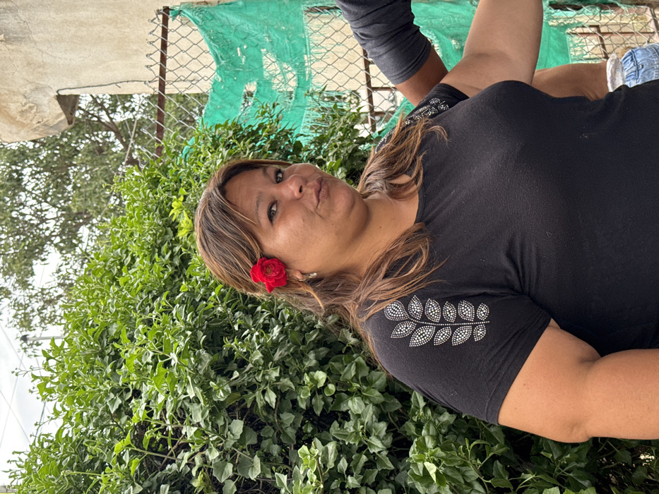 An outdoor scene in San Fernando del Valle de Catamarca, Argentina, depicts an adult female positioned slightly right of center, looking directly towards the camera. She has shoulder-length brown hair with lighter highlights, a red rose tucked behind her right ear, and a silver earring. She is wearing a black, short-sleeved t-shirt adorned with silver-studded, leaf-patterned embellishments on both shoulders. Her lips are pursed. To her right, partially visible, is the right arm and torso of a second individual, wearing a dark grey t-shirt and blue denim shorts. The background on the left and center consists of dense green foliage. On the right, a metal chain-link fence with sections of green netting or tarp is visible, adjacent to a weathered concrete wall structure. The sky overhead appears overcast.