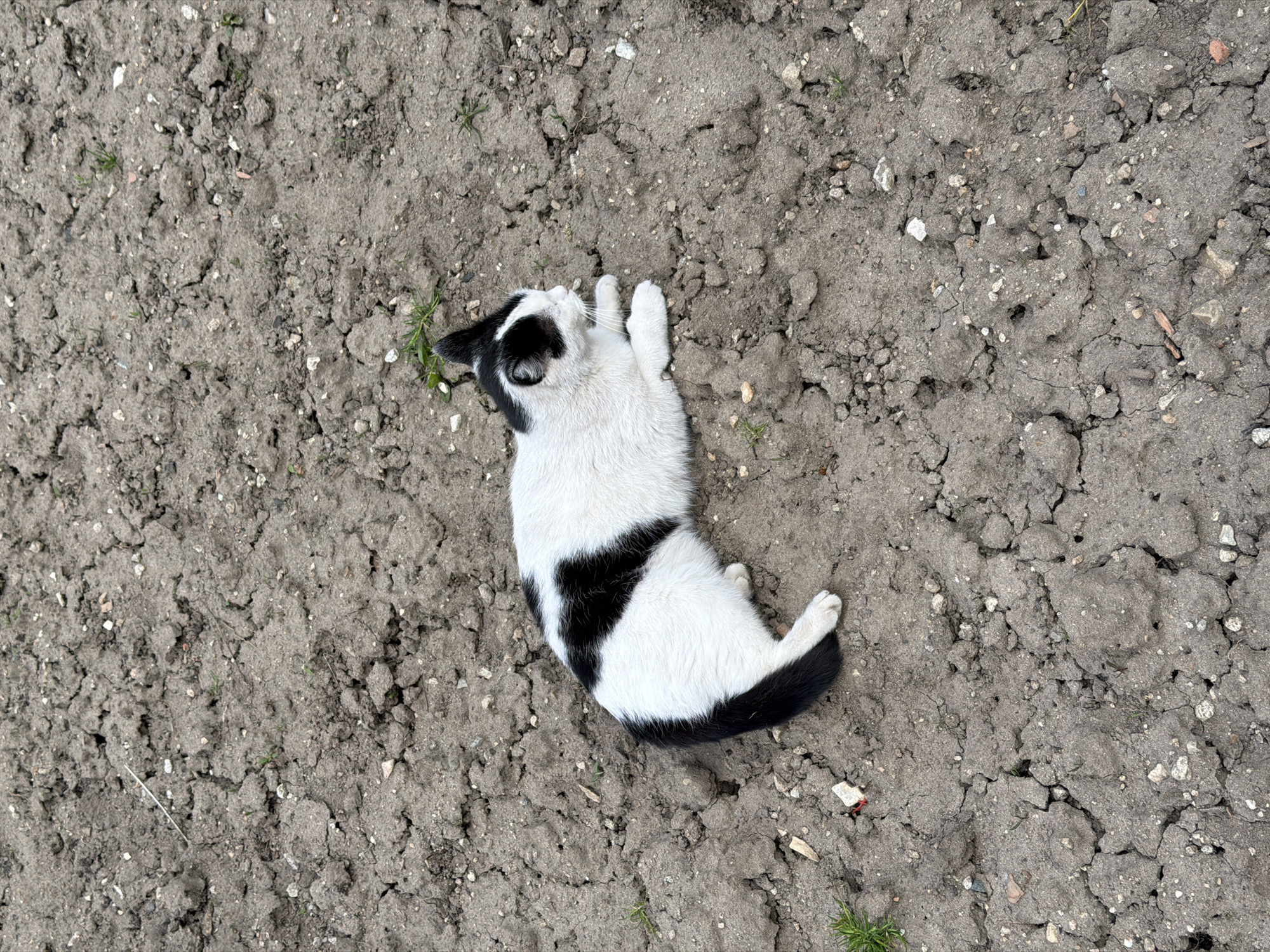 A black and white cat lies on its back on cracked, dry soil