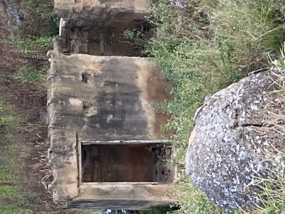 The image displays a dilapidated, roofless, single-story structure constructed of concrete or mud-plastered walls, situated in an overgrown outdoor environment within Bukuru, Nigeria. The structure's walls are discolored with varied tones of beige, brown, and dark grey, exhibiting weathering, staining, and exposed material. A rectangular doorway opening, devoid of a door, is present on the left, revealing debris on the interior ground. An additional, wider opening or collapsed section is visible on the structure's right side. The upper edges of the walls are uneven, with dry vegetation growing on top. In the foreground, a large, irregularly shaped grey boulder, mottled with white patches, occupies the lower left. The ground surrounding the structure and boulder is covered by dense, dry grasses, weeds, and small shrubs, which extend into the midground and background. A vegetated hillside or elevated terrain rises behind the structure. No individuals or active subjects are depicted.