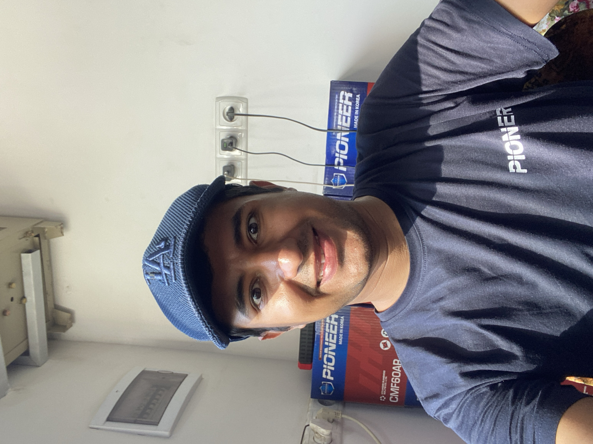 The image is a selfie of a man wearing a blue baseball cap with the letters "LA" embroidered on it. He is wearing a dark blue t-shirt with the word "PIONEER" printed in white on the chest. Behind him are two blue and red boxes labeled "PIONEER MADE IN KOREA" and "PIONEER CMF60AB" . A white wall with three electrical outlets is visible, with charging cables plugged in. The location may be Bukhara, Uzbekistan.