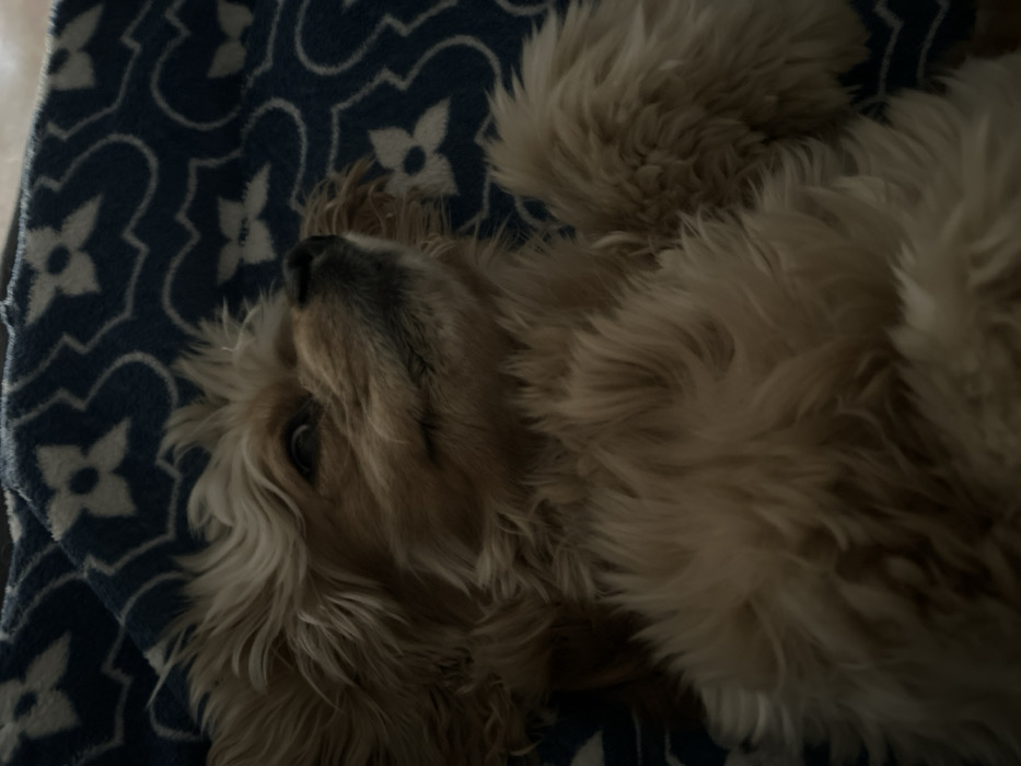 - "A small, light-colored domestic canine, displaying tan to cream-colored wavy fur, is depicted lying supine on a blue patterned textile" by FM-jaRbj2, licensed under CC BY 4.0