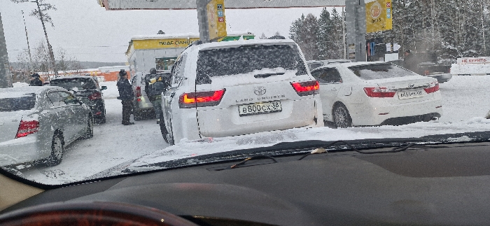 A winter scene depicts a gas station queue seen from inside a car. Cars, including a white Land Cruiser (license plate B800CX38) and two white sedans, are covered in snow. People are seen near a yellow and white building. A "NO SMOKING" sign is visible on a post. The image is taken from behind a dashboard, with parts of the steering wheel and windshield visible. Snow falls heavily, obscuring some details of the background.