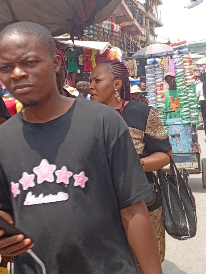 This image captures a bustling street market scene in Fegge, Nigeria. The foreground is dominated by a dark-skinned adult male, positioned slightly to the left, looking directly at the camera with a neutral expression. He has close-cropped dark hair and wears a black short-sleeved t-shirt adorned with five prominent pink star appliques across the chest, with partially visible lighter text "ludetail" underneath. He holds a dark object, likely a smartphone, in his right hand. In the midground, to the right of the foreground male, a dark-skinned adult female is visible, looking towards her right (viewer's left). Her hair is styled in reddish-brown braided extensions, and she wears large, multi-beaded dangle earrings. She is dressed in a dark top over a brown garment patterned with a repetitive "GG" logo. A black plastic bag hangs from her left hand. The background reveals typical market activity. To the left, behind the midground female, a stall displays various t-shirts (green, red, yellow) hanging under a white awning. Further back, on the right, a dark-skinned male wearing a bright green t-shirt with a light "VA" logo and a red baseball cap stands beside a market stall. This stall features numerous white-packaged goods, stacked high on a blue cart. An open dark umbrella provides shade over this stall. Multi-story buildings are visible in the far background, and overhead, a dark fabric canopy stretches across the market area. Multiple other indistinct figures are present throughout the background, indicating a crowded environment.