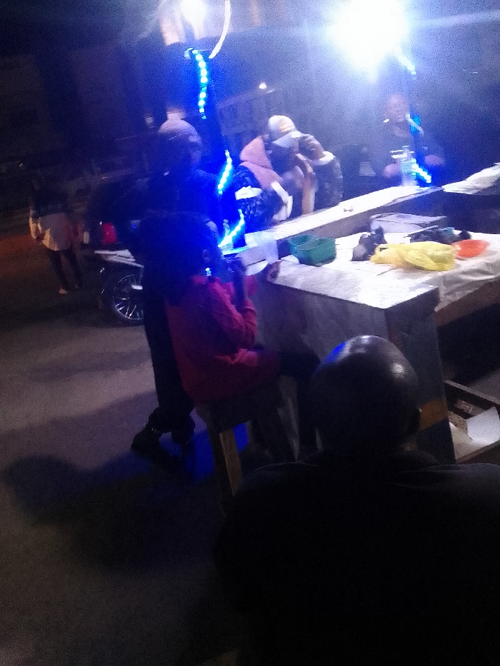 People gather near a brightly lit stall at night. A person in red sits on a stool by the stall, while others stand nearby. Blue lights illuminate the scene. A motorcycle is parked near the stall. Another person sits facing away from the camera in the foreground. The image appears to be taken at an outdoor food or vendor stand.