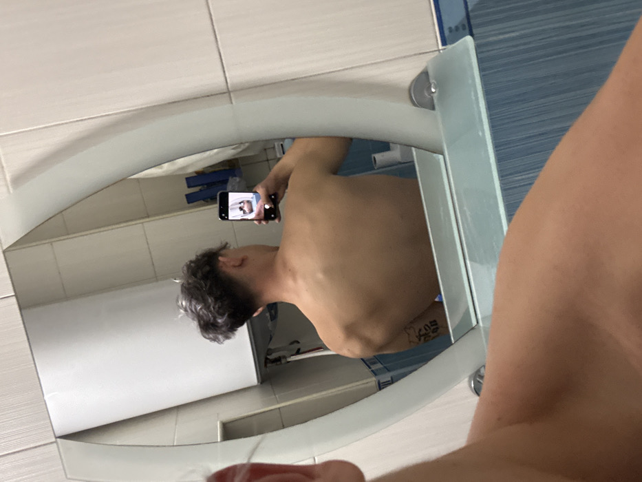 The image depicts a shirtless individual taking a mirror selfie in a bathroom located in Petrich, Bulgaria