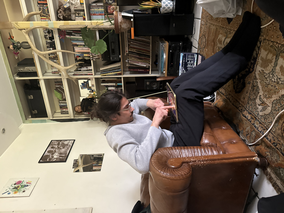 A person with long dark hair and glasses sits in a brown leather armchair, using a tablet. Their legs are extended, resting on a rug. Behind them is a bookshelf filled with books, records, and decorative items, including antlers. Artwork adorns the wall. A laptop sits on a nearby table, along with speakers and electronic equipment. The room appears cluttered but lived-in.