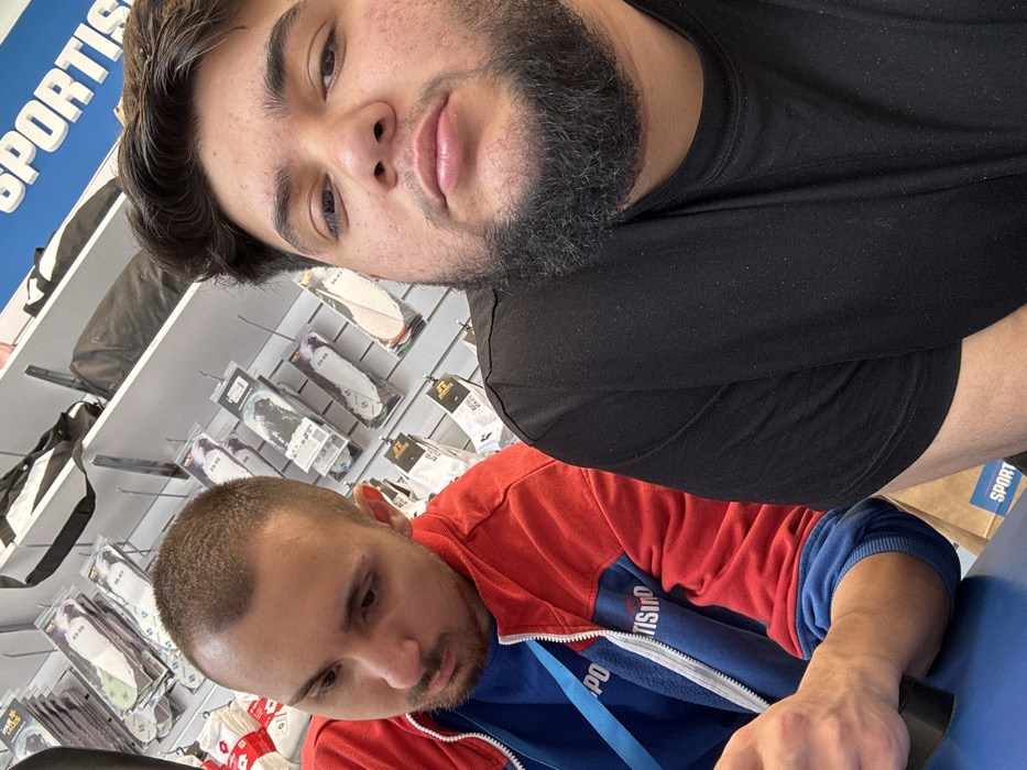 The image depicts two adult males within a Sportisimo sporting goods store located in Sofia, Bulgaria
