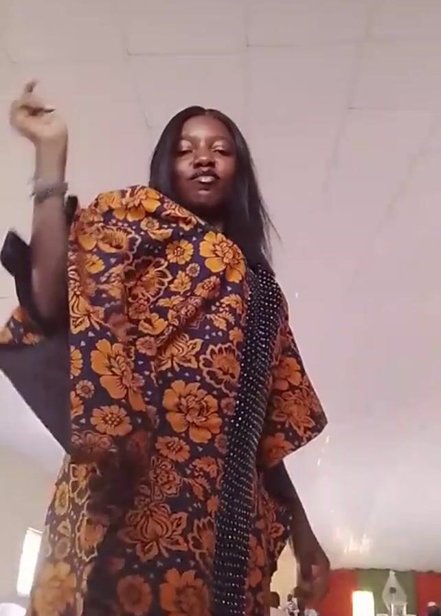 A woman is dancing in a room. She is wearing a brown and black floral pattern dress with a black beaded front. She has long black hair and is wearing a watch on her left wrist. She raises her arms and smiles. Other people are in the background, and some chairs are visible. The room has a light-colored ceiling and walls. A bit of red trim is visible around a window.