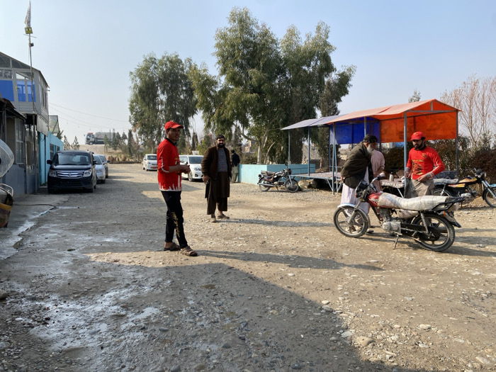 The image depicts an outdoor scene in Deh Sabzi, Afghanistan, on a clear day with bright sunlight casting shadows to the lower-left