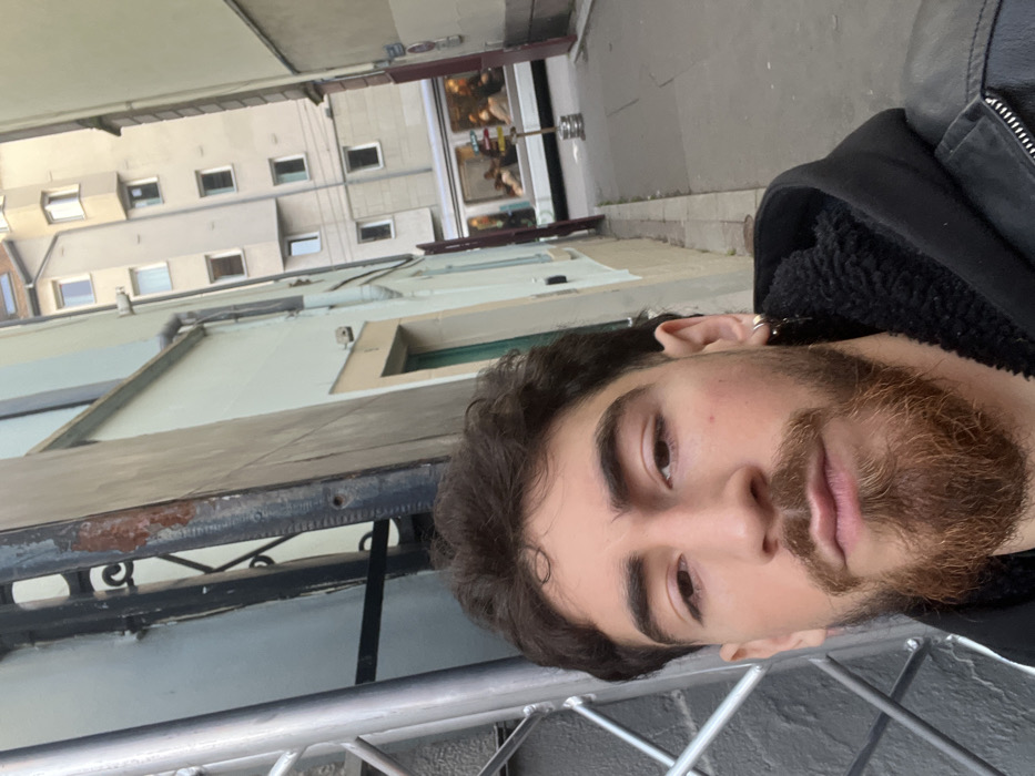 A close-up selfie of a man with brown curly hair and a light brown beard, wearing a black leather jacket with a sherpa lining. He is outside in a narrow urban space with tall buildings visible in the background. A metal railing is in the foreground. The photo is taken at an odd angle, with the buildings appearing to rise vertically behind him. The lighting is even and natural.