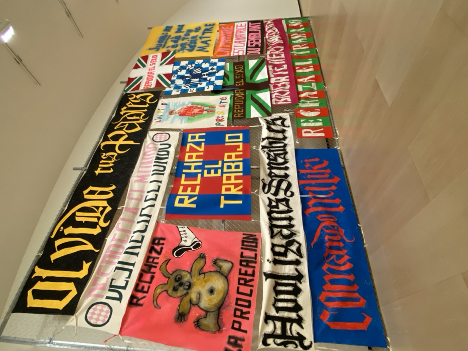The image depicts an art installation within the Guggenheim Museum Bilbao, Spain. The primary subject is a large, vertical display composed of approximately two dozen colorful fabric banners. These banners are individually hung and arranged in a dense, grid-like pattern on a prominent grey metal mesh or fence structure that extends horizontally across the frame. The banners vary significantly in size, color, and design. Many feature bold, hand-painted or printed text, primarily in Spanish, with some French phrases. Notable texts include "OLVIDA tus PADRES" (Forget your parents) on a black banner with yellow gothic script at the top; "RECHAZA EL TRABAJO" (Reject work) on a blue and red striped banner; "REPUDIA EL SEXO" (Repudiate sex) on a banner incorporating green and red stripes suggestive of the Basque flag; and "Hooligans Sensibles" (Sensitive Hooligans) on a white banner with black gothic lettering. A red banner displays a cartoonish, plump, light-brown rabbit figure and the partial text "LA PROCREACION" (Procreation). Another blue banner at the bottom displays "Comando Muliki" in red gothic script. The installation is situated in a clean, minimalist indoor exhibition space. The floor is constructed of light-toned wooden planks arranged in a herringbone or parallel pattern, reflecting overhead fluorescent or LED track lighting fixtures visible on the white ceiling. The walls are uniformly white, providing a stark background for the colorful artwork. No people are present in the scene. The perspective is from a low angle, looking upwards and across the length of the installation, emphasizing its scale.