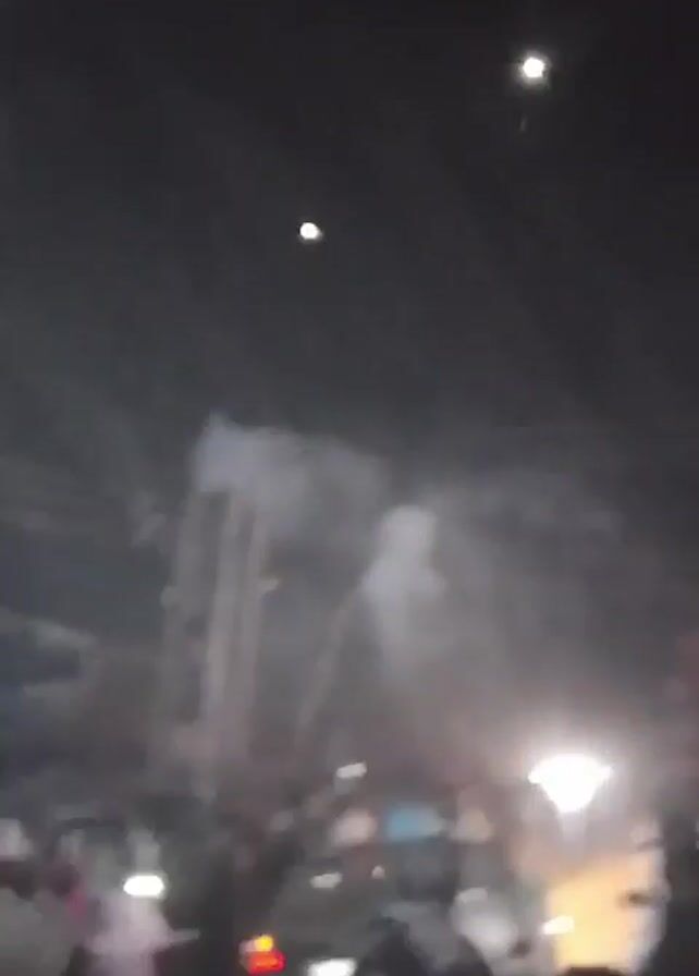 The video captures a nighttime scene with a large crowd of people gathered. Fireworks are being set off in the distance, with streaks of light visible in the sky and smoke filling the air. There appears to be some kind of structure in the background, possibly a stage or scaffolding. The crowd is moving, and individuals are partially visible, their features obscured by the lighting and distance. The scene is chaotic, with flashes of light and indistinct sounds.