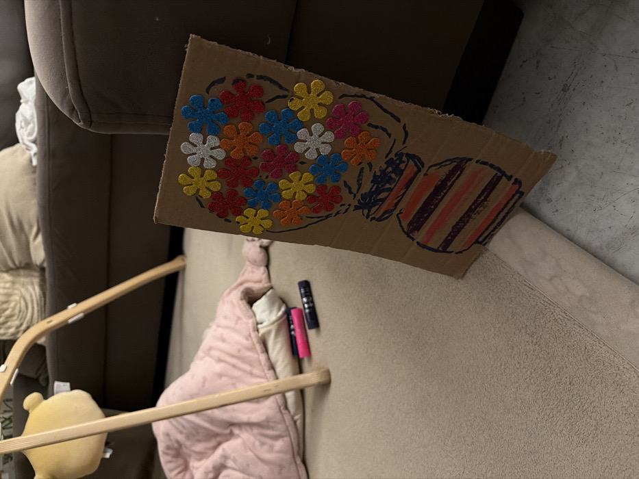 A tan couch holds a child's drawing on cardboard of a gumball machine decorated with colorful, glittery flower stickers