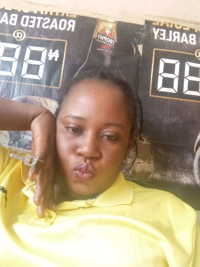 An adult female with dark skin and braided hair is captured in a close-up, chest-up shot. She wears a yellow collared polo shirt. Her lips are pursed, and her right hand, displaying a silver ring on the left ring finger, rests against her right cheek. A set of keys, featuring a translucent, possibly plastic, key head, is held between her index and middle fingers of the right hand. The background consists of a wall covered by two dark-colored advertising posters that appear worn, creased, and partially detached. The posters display a reversed image of a bottle labeled "TROPHY," reversed text including "ROASTED BARLEY" and partial "BARLEY," and prominent white digital-style numbers "88" with a "#" symbol. The specific location within Sabon Gari West, Nigeria, cannot be determined from the visual evidence.