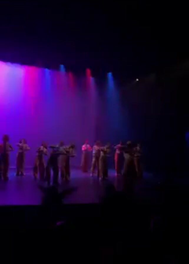 The scene shows a group of dancers performing on a stage under red and blue spotlights