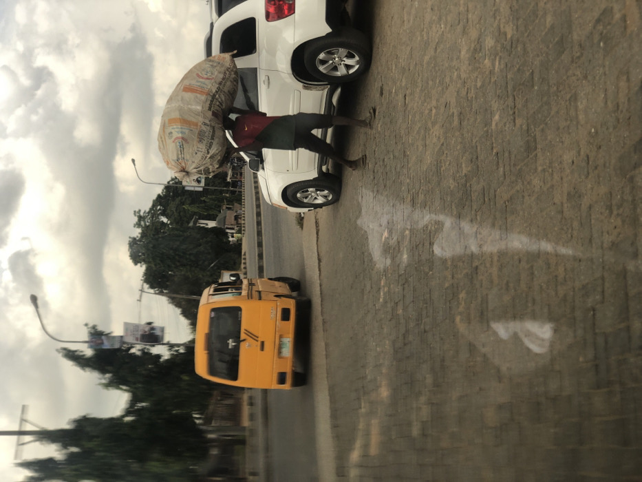 The image depicts a street scene in Lagos, Nigeria, under an overcast sky