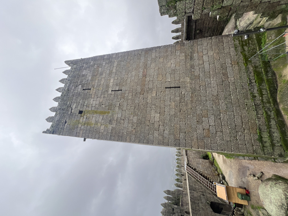 A tall, rectangular stone tower rises prominently. The tower is constructed of rough-hewn stones, forming a solid, imposing structure. Its top is adorned with jagged, crenellated battlements. Small, rectangular openings are visible along the height. Adjacent to the tower, another stone wall stretches out, featuring similar crenellations. The surrounding area includes stone steps covered in moss, along with a walkway and a wooden ramp leading upwards along the wall. The sky above is overcast with dense, gray clouds.