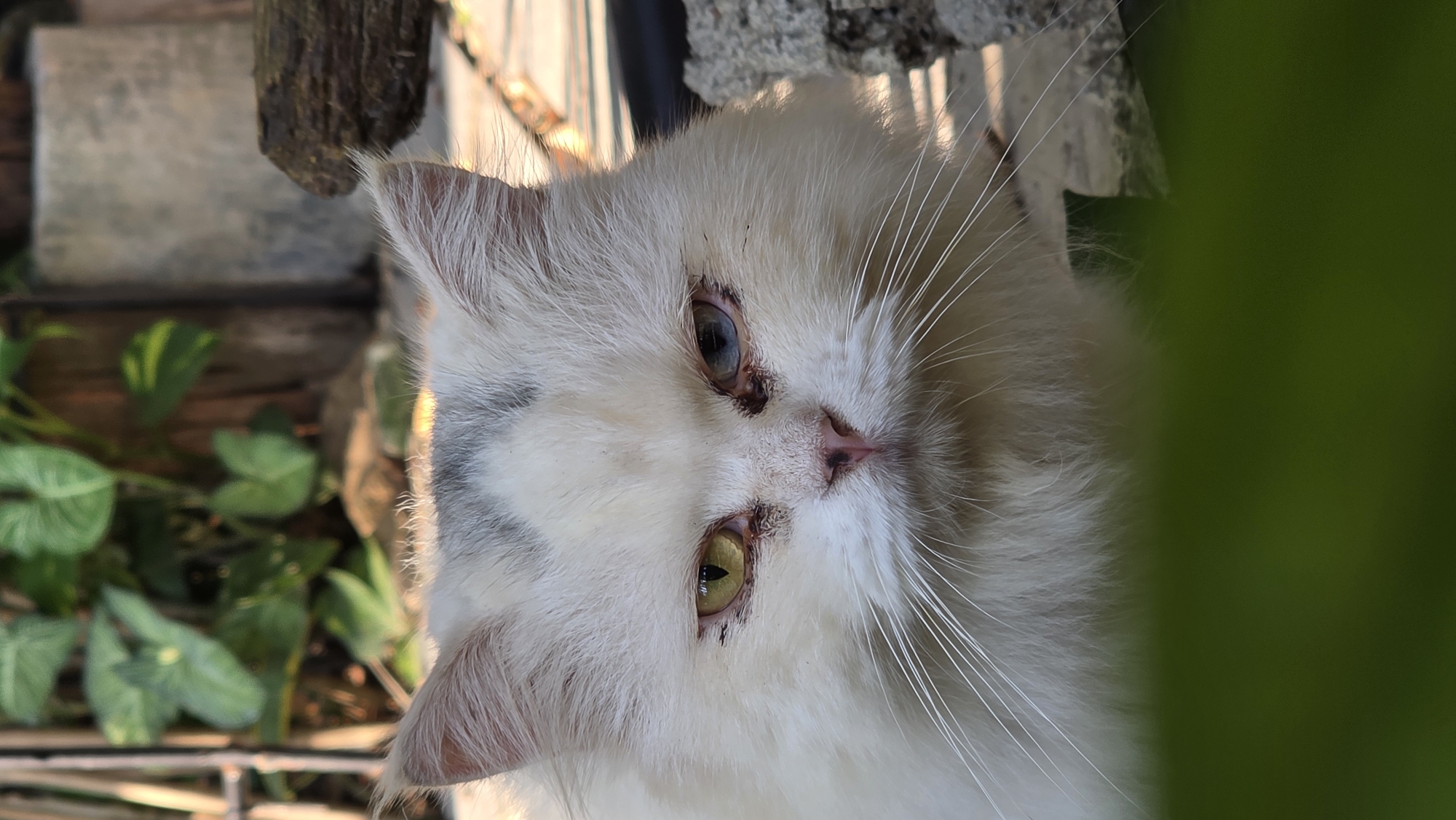 A white cat with heterochromia (different colored eyes, one blue, one yellow) is seen in close-up. The cat's face is the main focus, with a pink nose and long white whiskers. The background includes green foliage, wooden planks, and wire mesh fencing. The location is Unknown, Vietnam. The cat is positioned indoors, possibly near a window or enclosure.