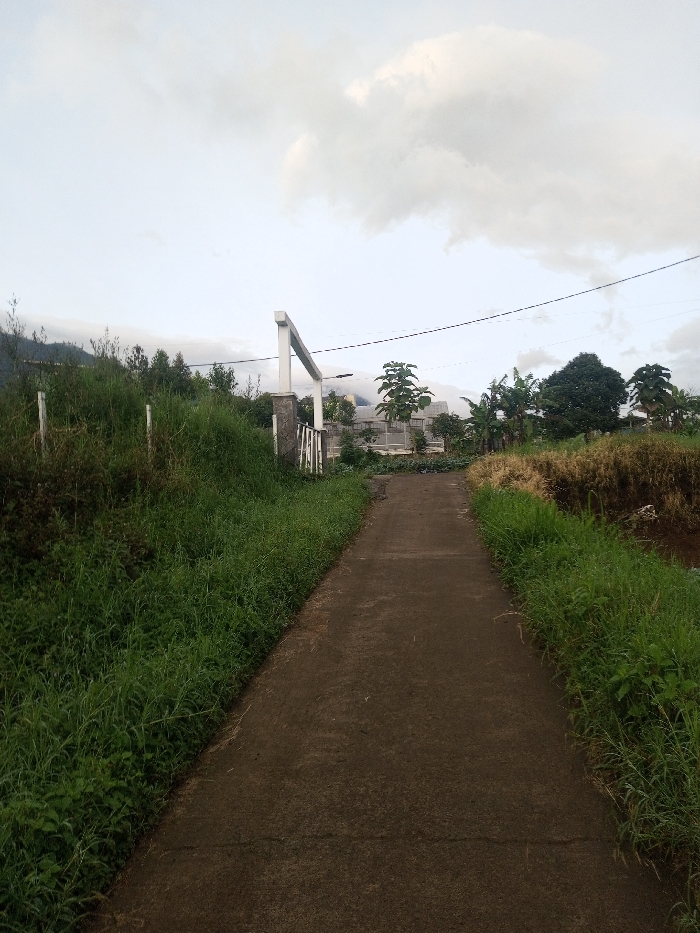 A concrete pathway stretches into the distance, flanked by overgrown grass. A white arched gate stands at the beginning of the path, marking the entrance to a property. Beyond the gate, a building is partially visible, surrounded by trees and vegetation. Cloudy skies dominate the upper half of the frame. A mountain range is faintly visible in the background. Power lines cut across the sky, adding a modern element to the otherwise natural scene.
