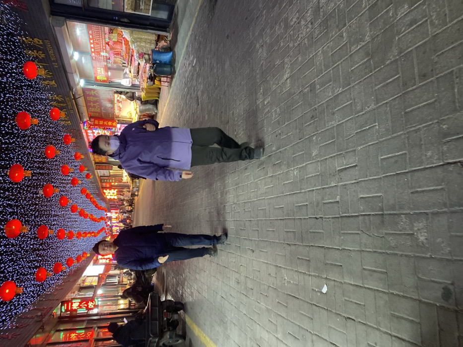 The image depicts an evening scene on a pedestrian street in Linghe, China, illuminated by numerous red Chinese lanterns and a dense canopy of small white string lights overhead. The street is paved with grey rectangular interlocking pavers arranged in a herringbone pattern; a faint yellow line runs along the left edge. In the foreground, two individuals walk towards the camera. On the left, a man wearing a dark blue puffer jacket, dark trousers, and dark shoes moves forward. To his right and slightly ahead, a woman wearing a two-tone purple winter jacket, dark trousers, and dark shoes walks while wearing a light-colored face mask and holding a dark object in her right hand. A watch is visible on her left wrist. The left side of the street features multiple storefronts with illuminated signs, some displaying Chinese characters, and a three-wheeled utility cart with individuals seated near it further down the street. The right side of the street also displays multiple storefronts, brightly lit, showcasing various goods such as produce, meats, and packaged items. A pair of yellow and a pair of blue rubber boots are visible on display outside one store. Additional individuals are present in the background, walking or standing near the market stalls.
