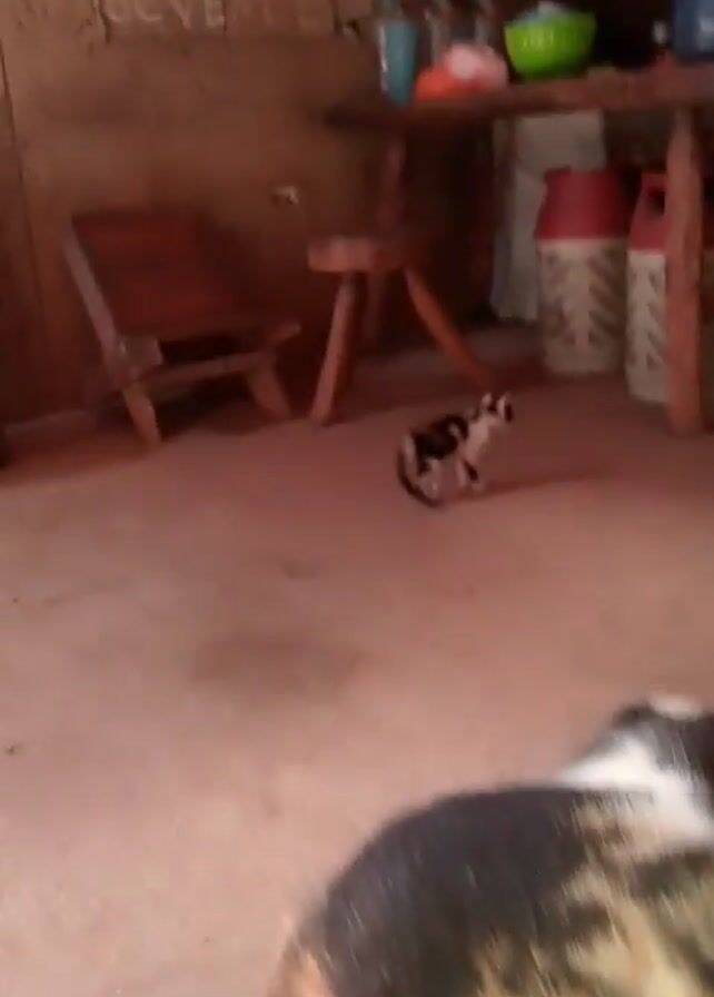 interior of a room with concrete flooring. In the background, there are wooden chairs, barrels, and a bucket. At one point, a blue motorcycle is visible in the background. Two cats are present; one is lying on a green stool, and the other is seen moving around the room. A person wearing slippers walks through the frame at one point. The video is taken with an Infinix SMART 8.