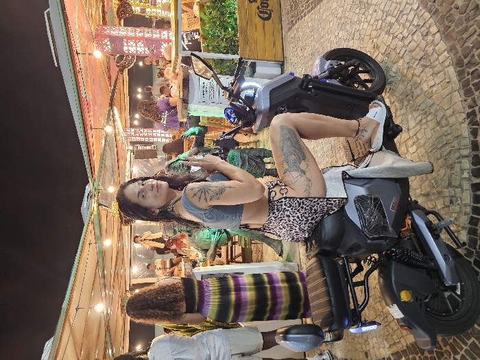 - "An outdoor nighttime scene in Rio de Janeiro, Brazil, likely on a beach promenade, depicts a woman sitting sideways on a dark gray electric scooter on a mosaic-tiled pavement" by FM-BT1Sm1, licensed under CC BY 4.0