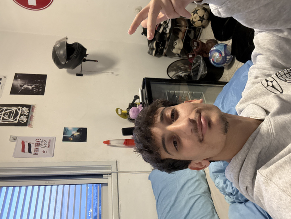 A young man lies sideways on a blue bed. He wears a grey hoodie with a graphic on the sleeve. Behind him is a white wall decorated with posters, a motorcycle helmet, and a Heineken sign. To the left is a window with blinds. Above him is a shelf holding soccer balls and shoes. He has dark curly hair and a slight mustache and is making a peace sign with his right hand.