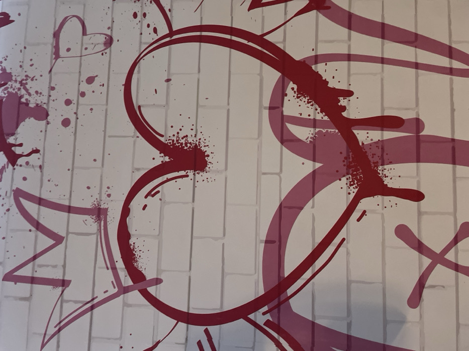 The scene depicts a section of a wall in Ново-Никольское, Russia, featuring a graphic mural. The background displays a light grey brick pattern, simulating a brick wall surface. Centrally, a large, vibrant red heart is prominent, exhibiting characteristics of spray paint or stencil art with distinct paint splatters and drips. Above and to the left of this main heart, a stylized red "M" shape topped with a crown outline is rendered, also with paint splatters. Further red paint splatters are scattered across the upper frame, along with a smaller, outlined red heart to the upper right. Underlying and partially obscured by the main red heart are translucent, faded magenta-pink abstract shapes, including curved lines and an 'X' figure, indicative of layered graphic elements. No individuals, actions, or direct interactions are visible.