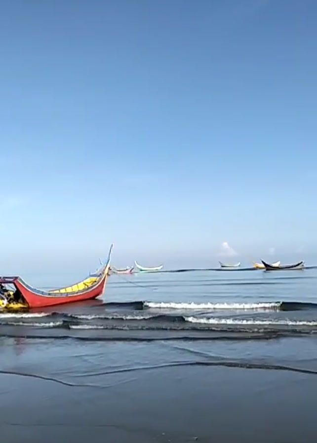 calm sea with several boats. The boat closest to the viewer is red and yellow and is docked on the dark sand of the beach. In the background, several other boats can be seen further out on the water. The sky is clear and blue. The waves are small and gentle. The environment is tranquil and serene.