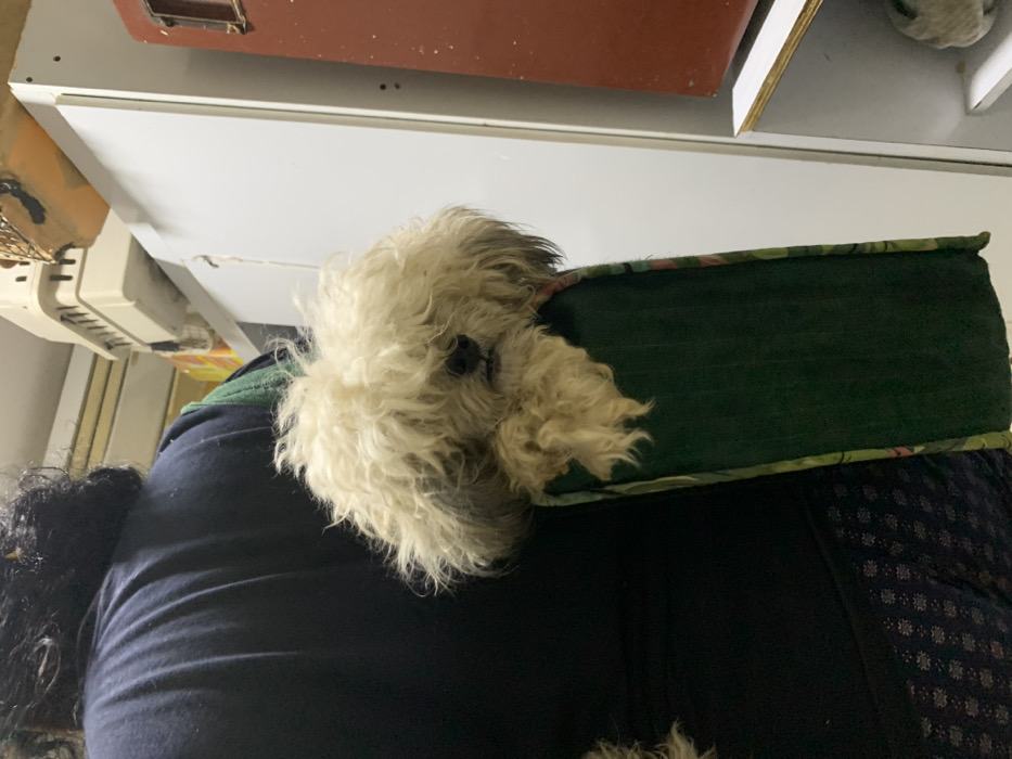 The image displays an indoor scene; the precise location in Juan Griego, Venezuela, is not discernible from the visual evidence. A person, viewed from the upper back, is visible on the left. This individual wears a dark blue short-sleeved top over a dark blue garment patterned with small light-colored shapes, and has dark, curly hair. The person is holding a dark green fabric pet carrier or sling, which features a colorful patterned lining. Resting inside the carrier, a small dog with shaggy, cream-colored fur is positioned with its head at the carrier's edge. The dog's eyes are obscured by its long facial fur, and its muzzle area shows darker fur. The background on the right features a white cabinet or wall. Above this, a light-colored, multi-tiered pet carrier is stored on a shelf. To the far right, a reddish-brown object, possibly a door or piece of furniture, is partially visible. A white shelf with a thin light-colored trim is located below the reddish-brown object. The environment is illuminated by an apparent artificial light source.