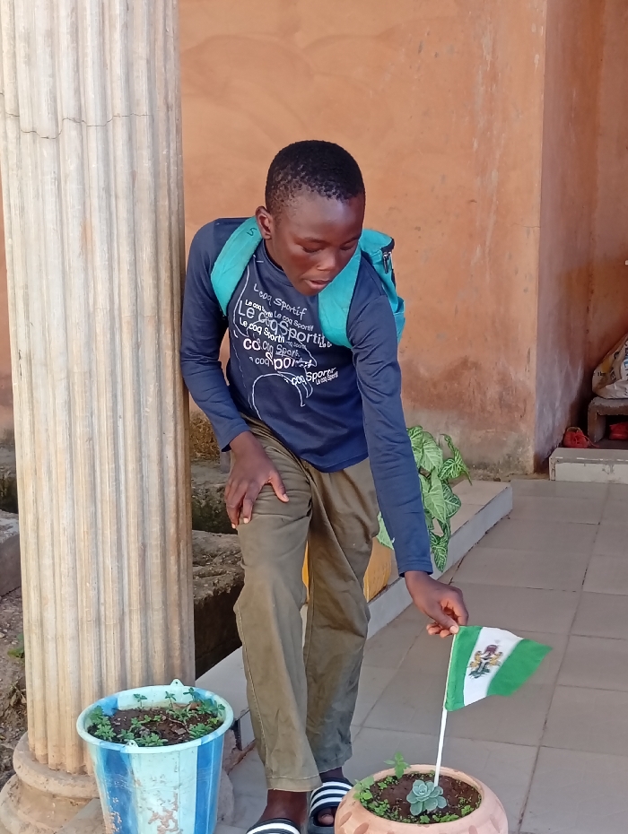 A young Black male stands in Barakin Akawo, Nigeria, leaning against a fluted light-colored column on the left side of the frame. He wears a dark blue long-sleeved shirt, olive green trousers, and black and white striped slide sandals. A teal backpack is visible on his shoulders. He is looking downwards, with his left hand holding a small Nigerian flag (green-white-green with the national coat of arms) by its white stick, positioning it into a terracotta pot containing a succulent plant and small sprouts. His right hand rests on his right knee. To his left, a light blue and white striped plastic pot with small sprouts sits near the column's base. The background consists of a reddish-brown wall and light brown tiled flooring. A leafy plant is visible on a raised step in the far right background.