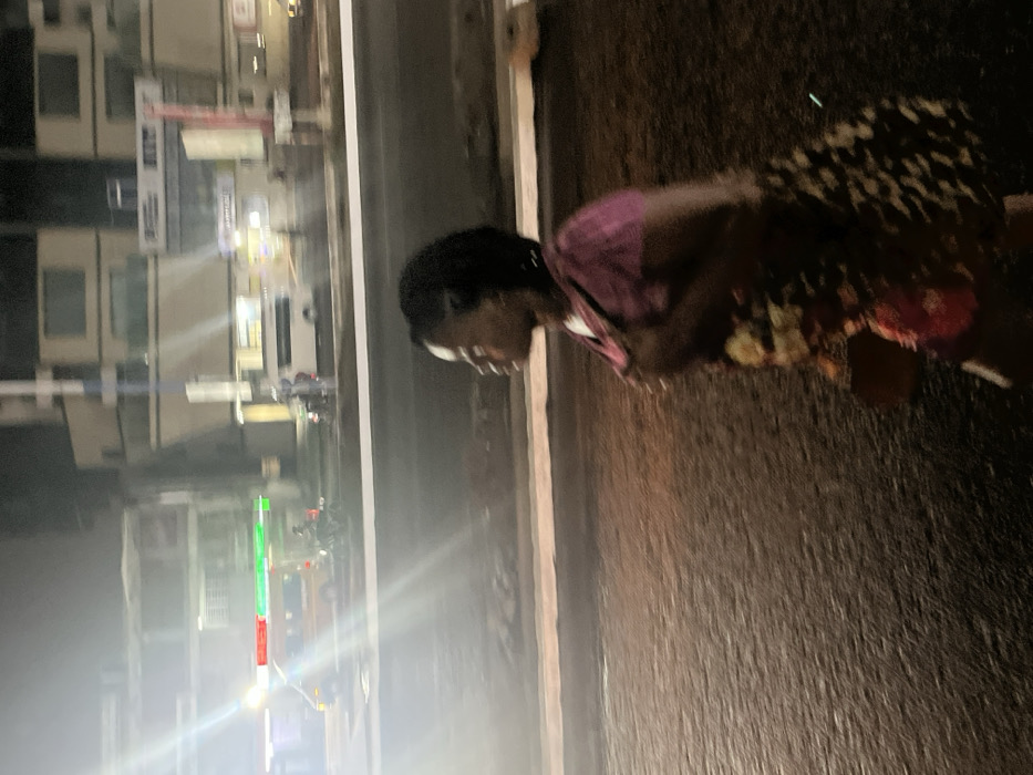 A side view depicts a person with dark hair and skin, wearing a floral patterned top with a purplish hue. They face left, towards an urban nighttime scene. Across the frame, buildings are faintly visible, illuminated by streetlights that cast bright flares. The ground appears dark, suggesting wet pavement or similar surface. The overall scene has a blurred quality, possibly captured in motion or low light.