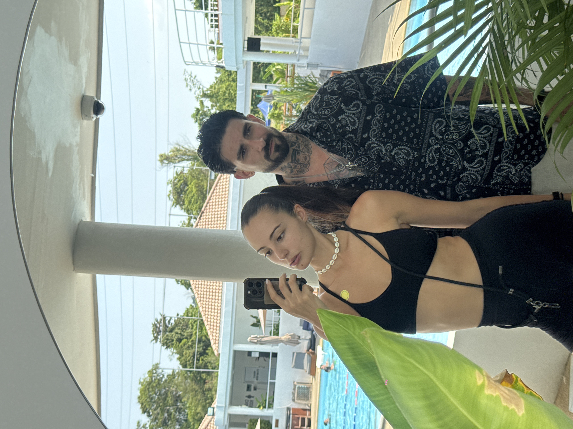 The image is a mirror reflection depicting a woman and a man in an outdoor setting identified as Kathu, Thailand. The woman, positioned on the left, has dark hair tied back in a ponytail. She wears a black athletic-style top, black form-fitting lower garments, and a white shell choker necklace. A circular yellow adhesive patch is affixed to her upper left chest. She holds a black smartphone with multiple rear cameras in her right hand, pointed towards the reflective surface, actively capturing the image. A black cord strap with metallic key-shaped attachments extends from her midsection. Her gaze is directed slightly to her left. The man, standing to the woman's right, has dark hair, a beard, and a mustache. Visible tattoos cover his neck and arms. He wears a black short-sleeved button-up shirt with a white paisley pattern. A silver chain with a cross pendant and an additional pendant hangs around his neck. He is wearing light-colored trousers, partially visible. His gaze is directed forward, towards the camera. The background reveals a bright outdoor environment, likely a resort or club. A large blue swimming pool occupies the midground, with lane lines and at least two individuals partially submerged. Beyond the pool, white buildings with terracotta-tiled roofs are visible, along with white metal railings, lounge chairs, and folded patio umbrellas. Lush green tropical foliage and trees frame the scene. A white cylindrical support pillar stands centrally, and a white dome-style security camera is mounted on a white overhead structure. The image foreground is partially obscured by large green plant leaves on the left and palm fronds on the right.