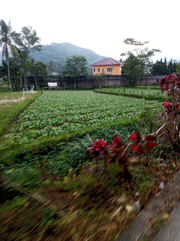 This image depicts an agricultural landscape in Kheda, India, observed from a moving perspective as indicated by the motion blur in the foreground. A large field of uniformly green, low-growing crops, likely leafy vegetables, dominates the midground, organized in discernible rows. A narrow, darker green, slightly raised strip of vegetation or earth horizontally divides the crop field. In the immediate foreground, blurred red-leafed plants and other indistinct green and brown vegetation are visible, with a partial concrete curb or edge on the lower right. Behind the cultivated field, a grey concrete wall stretches horizontally across the scene, forming a clear boundary. Various trees, including a tall palm tree on the far left and dense green foliage, are situated behind this wall. A small, white, tarp-covered structure, resembling a makeshift shelter or storage unit, is visible against the wall on the left side. To the right of center, behind the wall, stands a two-story building with yellow walls, a reddish-brown tiled roof, and several rectangular windows on its upper floor. In the far background, hazy, green-forested mountains rise against a light, overcast sky. No individuals or specific actions are discernible within the frame.