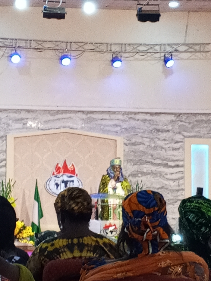 person wearing traditional attire standing behind a decorated podium. A Nigerian flag is visible to the left, with an emblem above. Attendees are seated in the foreground, obscuring the view of the stage. Lighting fixtures hang from the ceiling, illuminating the scene. The backdrop appears to be textured, with a decorative panel behind the podium.