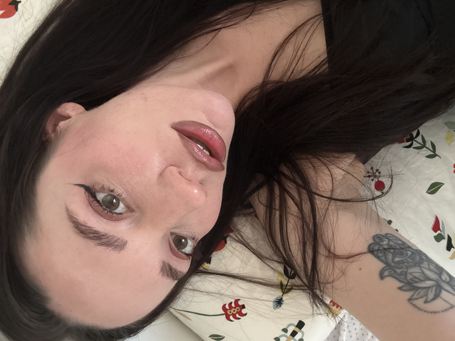 A close-up, angled self-portrait depicts a young adult female lying on a pillow or soft bedding indoors in Batumi, Georgia
