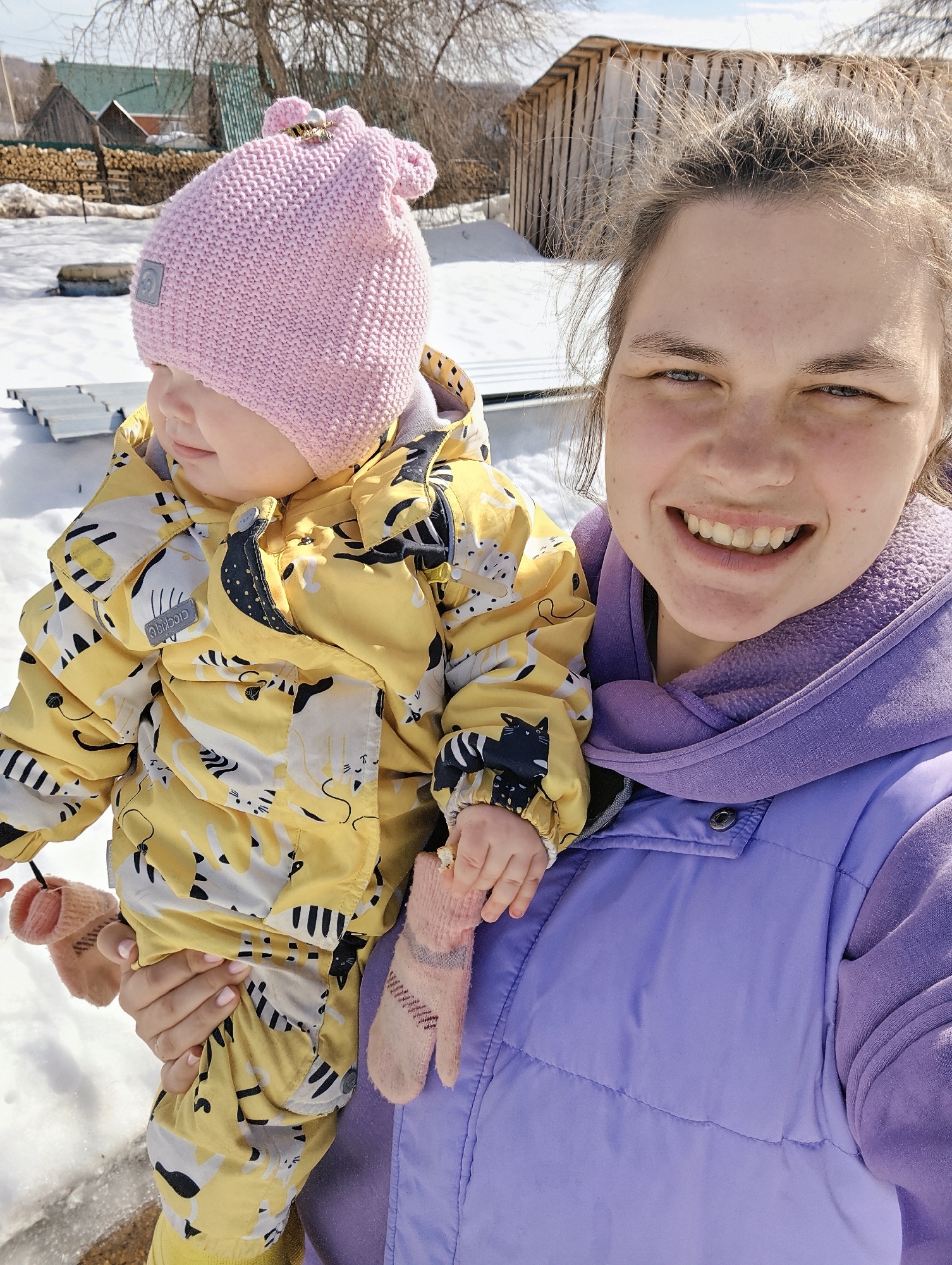 The image depicts an adult female holding an infant outdoors in a snowy environment within the city of Уральское, Russia, under bright daylight