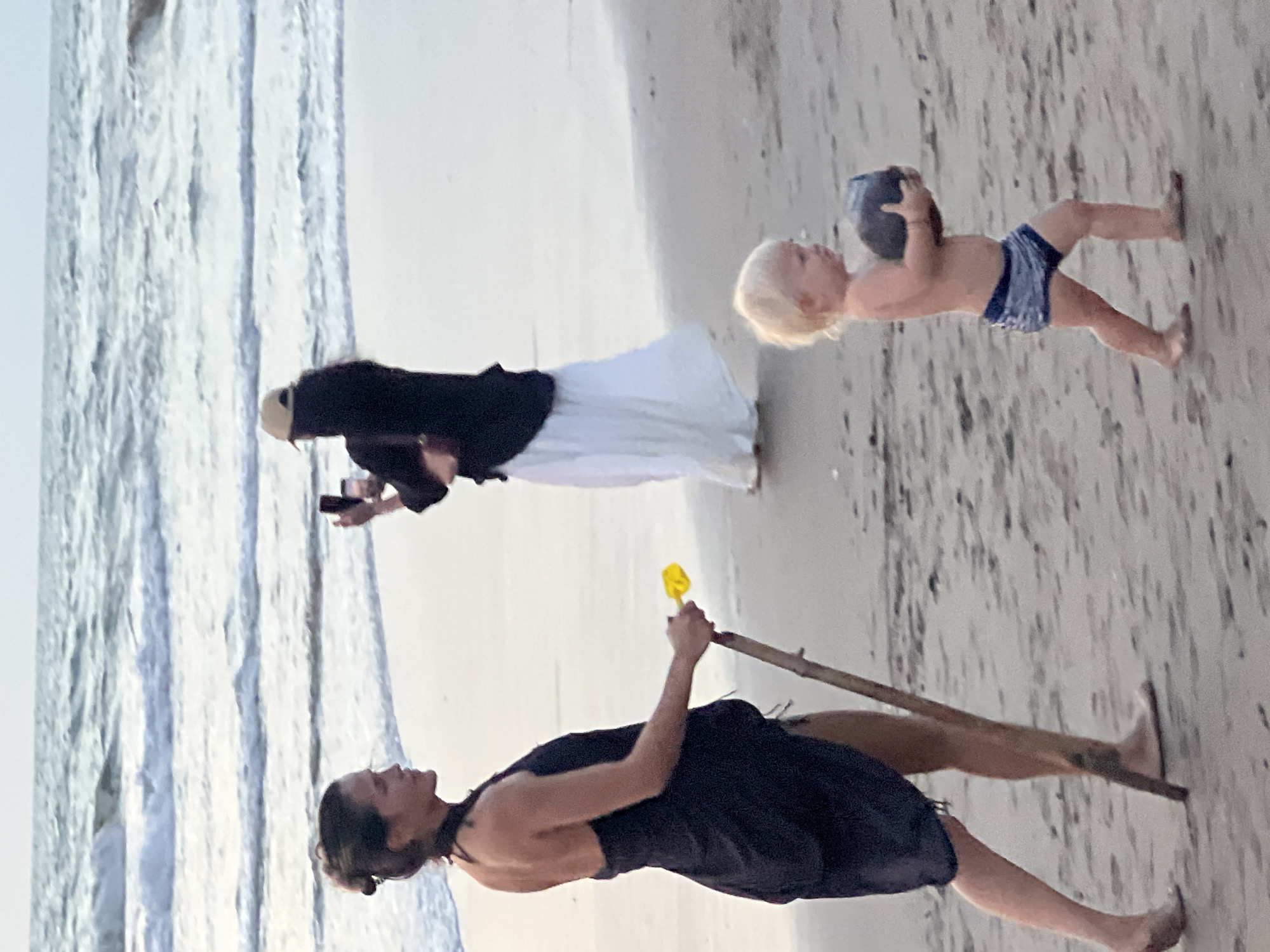 The image displays a sandy beach scene in Kerobokan Kelod, Indonesia, featuring three individuals and the ocean under an overcast sky. In the left foreground, an adult female walks barefoot from left to right. She has dark hair styled in a bun, wears a dark, possibly black, halter-neck dress, and carries a long, light brown wooden stick with a yellow shovel attachment in her left hand. To her right and slightly behind, a young child with blonde hair, barefoot and wearing blue and white striped swim trunks, walks from right to left. The child holds a dark, round object, resembling a small coconut or ball, with both hands against his chest. In the middle ground, closer to the water's edge, a second adult female stands facing the ocean, seen from behind. She wears a dark long-sleeved top, a long white skirt, and a light-colored baseball cap. She holds a smartphone in both hands, positioned as if taking a photograph or video of the ocean. A small dark bag is slung over her right shoulder. The background features the ocean with multiple lines of breaking waves and white foam extending to the horizon.